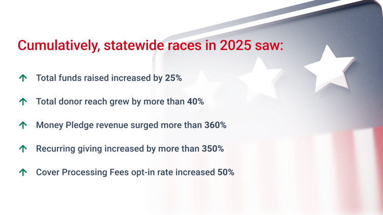 Top statewide races this election cycle experienced a 25% surge in revenue on WinRed, with a number of additional metrics proving heightened revenue through WinRed features compared to four years ago.