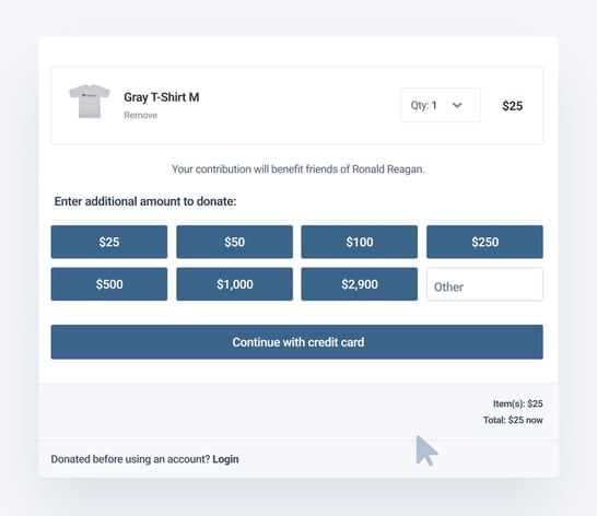 Prompt donors to add an additional donation amount to your campaign or organization when they check out on your WinRed storefront.