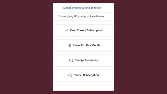 Rather than canceling outright, donors are now choosing to pause their subscription for a month, adjust the frequency, or simply maintain their existing commitment.