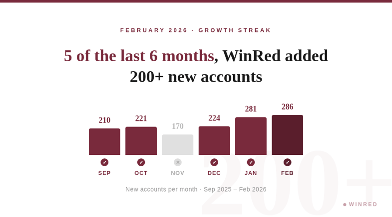 - February 2026 saw 286 new customers join the platform, more than any month in WinRed’s nearly 7-year history.