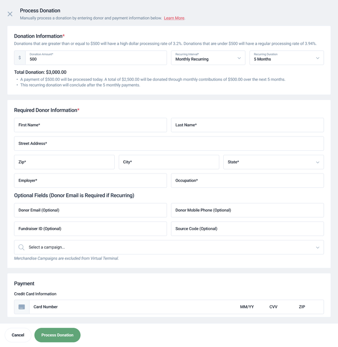 With Virtual Terminal, pricing is dynamic based on the amount. Donations of $500 and above use our high-dollar rate of 3.2%, and donations below $500 are charged 3.94%.