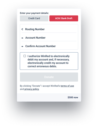 High-dollar donors can also donate by ACH on WinRed, for which donations are charged a low 0.8% fee capped at $5.