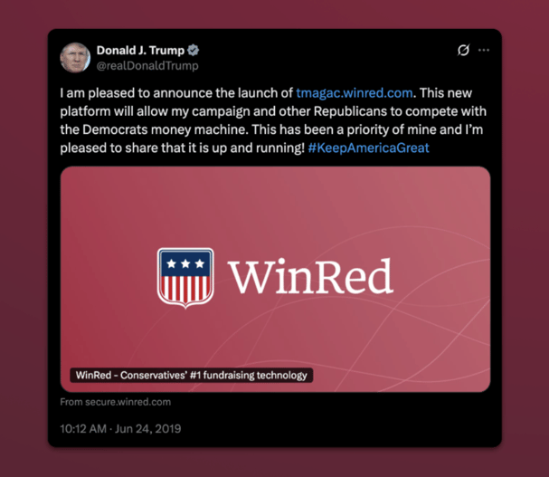 “The Trump campaign will be the most innovative Presidential campaign in American history, and WinRed is a critical component of our strategy. Trump supporters are the most enthusiastic in American politics, and with WinRed, we will have the cutting-edge technology needed to translate grassroots enthusiasm into the resources we need to win in 2020.”