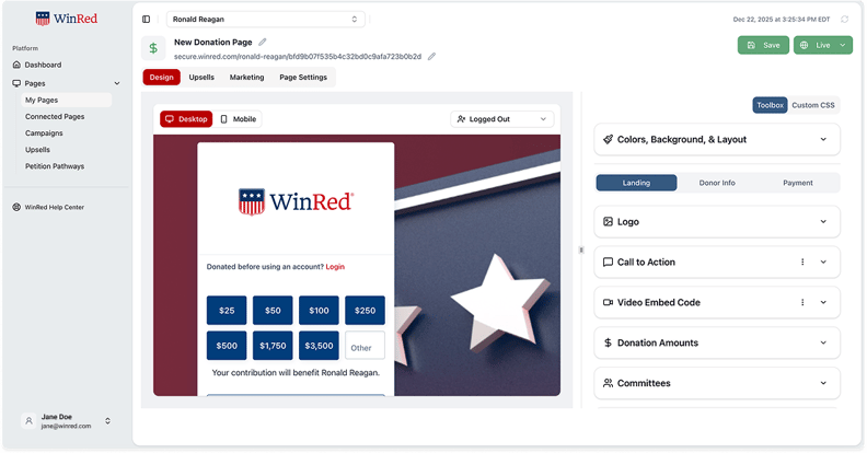 Fundraising teams are increasingly inserting complex design code into WinRed pages. Now, there's a bigger canvas to work with, and you can see your changes and results in real time.