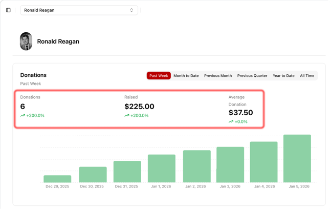 A new-and-improved Dashboard visualizes an account’s donation data for easy consumption and viewing. On the new reporting dashboard, a trend number is added showing the percent change from the previous time period.